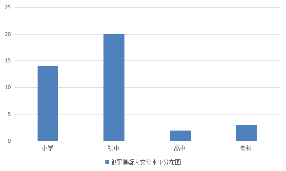 (四)犯罪嫌疑人文化水平普遍偏低,以初中及以下文化为主,小学文化程度有14人,占总数的35.90%;初中文化程度有20人,占总数的51.28%;高中文化程度有2人,专科文化程度有3人。
